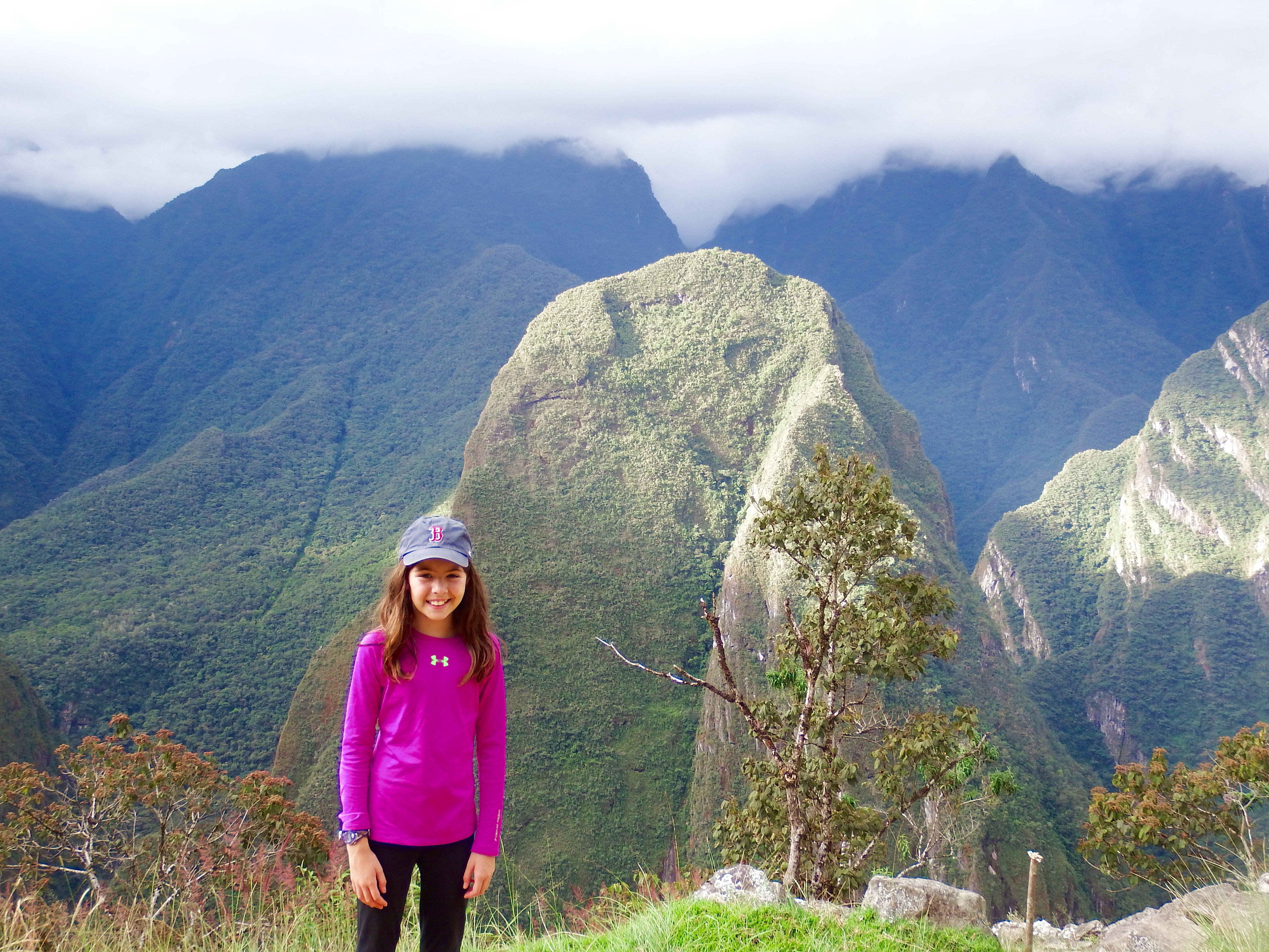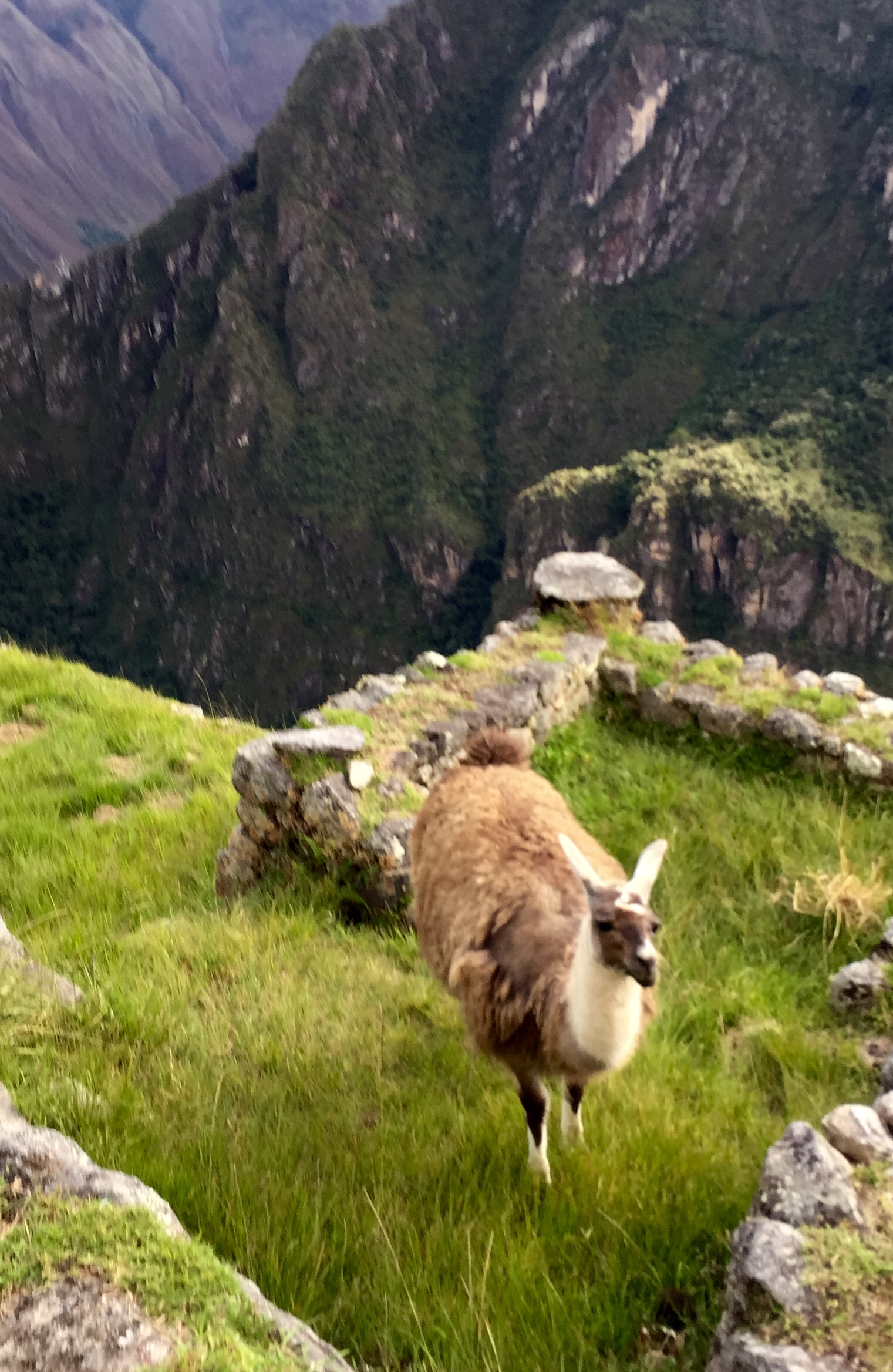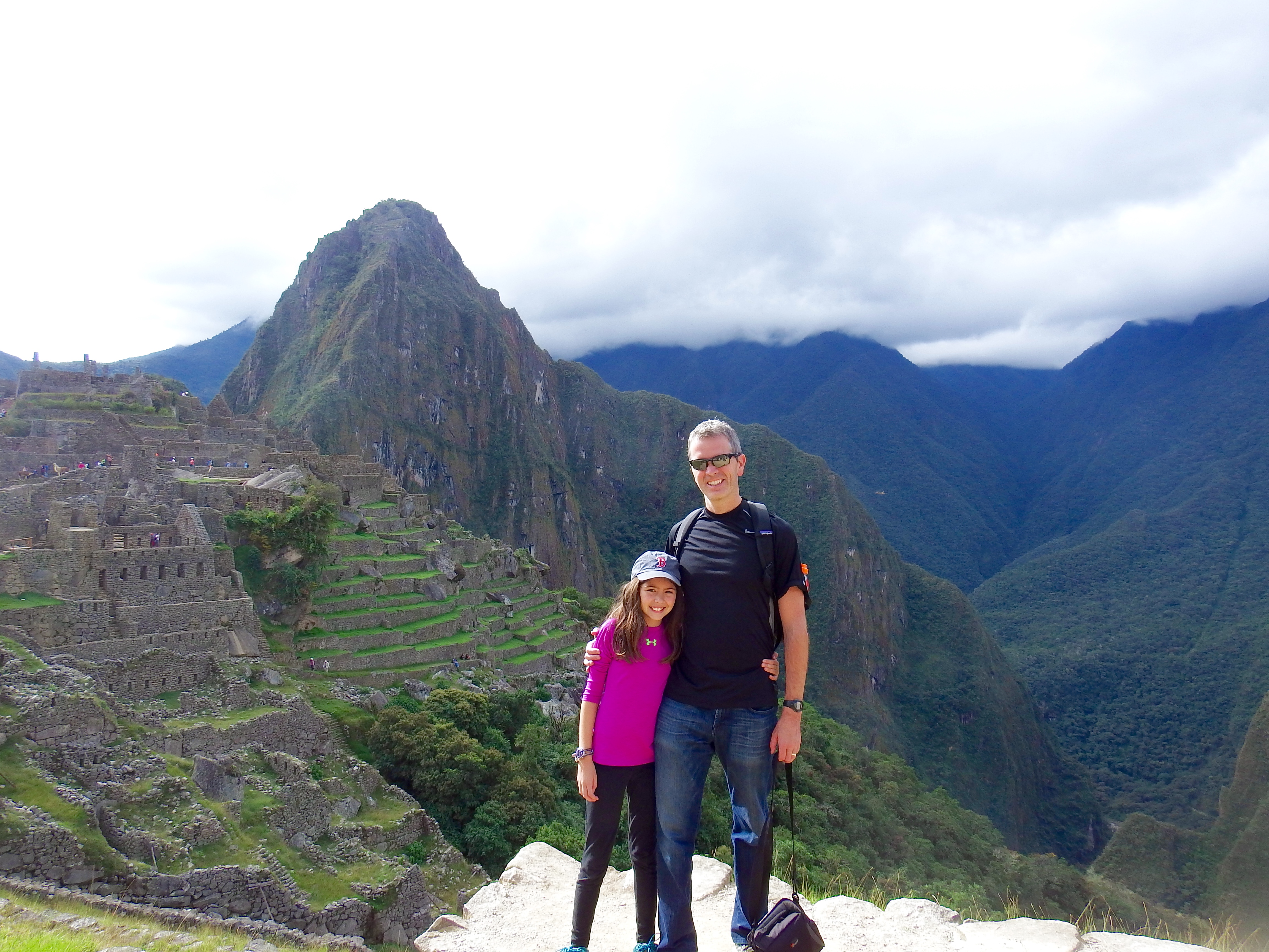Hiking near Machu Picchu...those shafts of light that peer through the clouds happen all the time. It is eery and awe-inspiring! Morning hike Like right out of a movie... Holy symbol of hell/earth/heaven steps (Snake, Puma, Condor) Yes, there are actual WILD llamas roaming the ruins of Machu Picchu! Needs no words... As you can tell, the kids loved the llamas... There's that lighting again...you can see why people call it a "spiritual experience" when you come upon it the first time... A reminder...these stones have stood for over 500 years and there is NO mortar...they are simply placed one on top of the other...it is incredible. Part of the reason no mortar was used is b/c of earthquakes...when one hits, they say the "stones dance" and land exactly where they were (!?!) You can see why the wild llamas stay. Good and easy eatin'. The guide took Audrey and the kids on a hike up above he ruins... Hairy-head and her mom. : ) OK. Sure. It was a staged pic by the guide but looking out at the Andes like that is pretty cool... Taking a break. I wish we could have all gone together but I'm glad Audrey got the experience of hiking MP with the three older ones! Now we are into pics that I took with Ella when she came BACK with me in the afternoon... This just kinda cracked me up for some reason. Something about the way she was climbing the stairs (her gait, etc.) made me think "whoa...she is an Audrey clone!" Selfie by the terraces... Me and my adorable little guide. : ) We found the Inca ruler's bathroom so we HAD to take this pic of me running to answer nature's call (for the record...you can't USE his bathroom anymore) This particular llama has evidently had enough... Trying out black and white... Hard to explain this one. On the train ride back there was this guy dancing down the aisle as a "spirit" or something. Of course this was followed by a fashion show trying to sell Alpaca sweaters.... This was our burning up sick kiddo sleeping away after the others went to Machu Picchu. She never let go of my hand. : ( Something about the town of "Aguas Calientes" (the town at the base of MP) felt like an old-western US town Everyone except Charlie had been sick or was sick. Thus the labeled cups in the hotel rooms for water. Cool footbridge near town. Going for a walk/hike the day after Machu Picchu (on the roads around the little town) Yup. Another festival of some sort. Brass bands, etc. We were trying to cheer her up by taking a pic. Didn't work. This was after Liadan vomited ALL over me at the dinner table in the hotel restaurant. Not sure why I pulled this pic other than for Audrey's look on her face. This was on the train when the 'spirit dancers' came out for the first time. : )