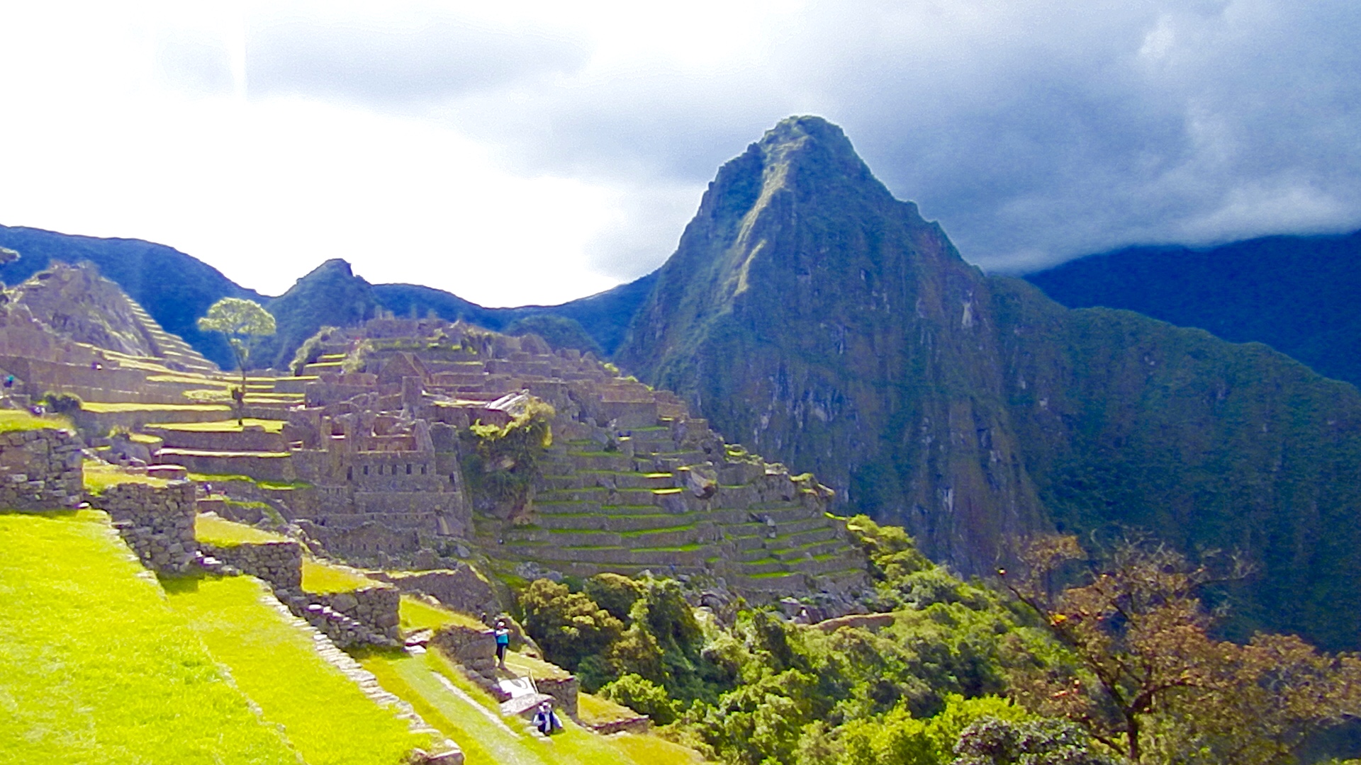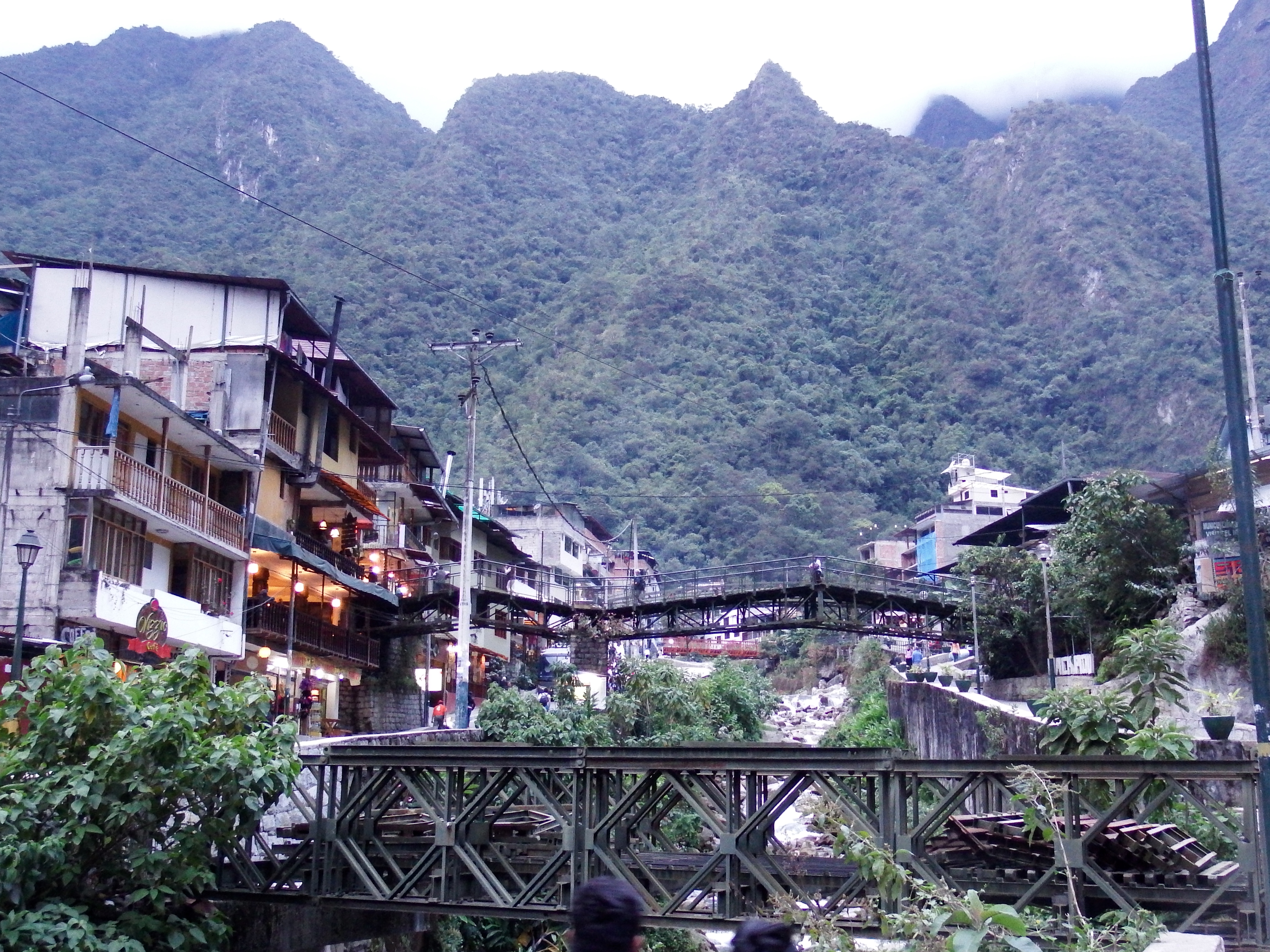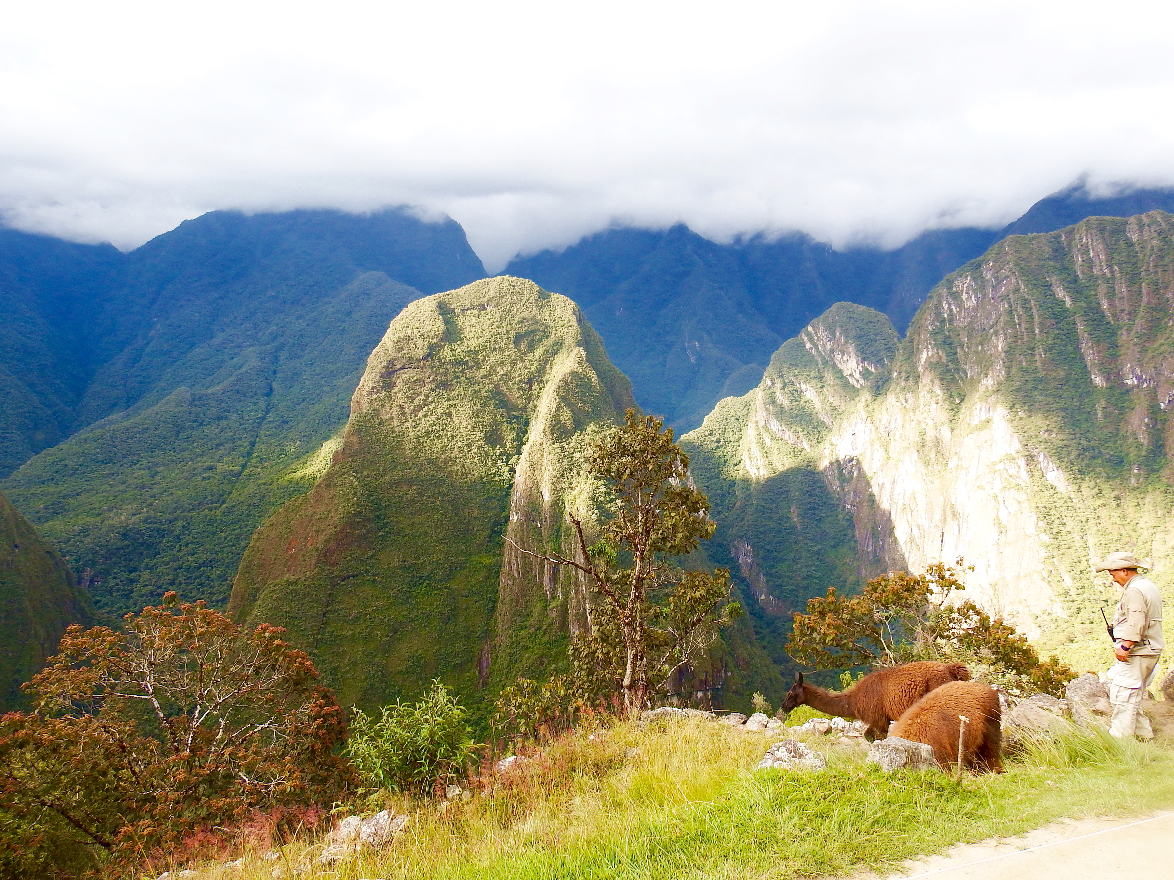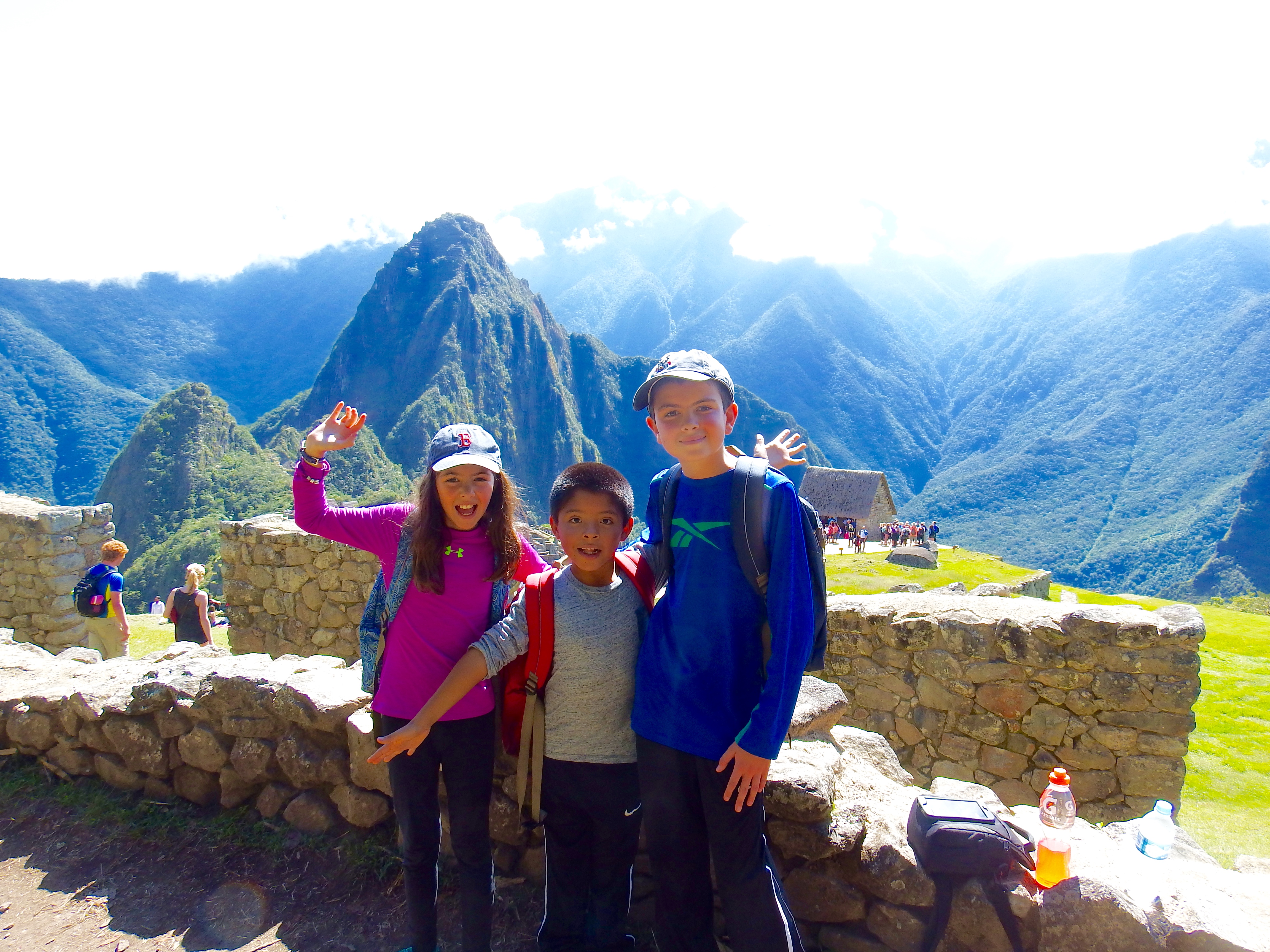 Hiking near Machu Picchu...those shafts of light that peer through the clouds happen all the time. It is eery and awe-inspiring! Morning hike Like right out of a movie... Holy symbol of hell/earth/heaven steps (Snake, Puma, Condor) Yes, there are actual WILD llamas roaming the ruins of Machu Picchu! Needs no words... As you can tell, the kids loved the llamas... There's that lighting again...you can see why people call it a "spiritual experience" when you come upon it the first time... A reminder...these stones have stood for over 500 years and there is NO mortar...they are simply placed one on top of the other...it is incredible. Part of the reason no mortar was used is b/c of earthquakes...when one hits, they say the "stones dance" and land exactly where they were (!?!) You can see why the wild llamas stay. Good and easy eatin'. The guide took Audrey and the kids on a hike up above he ruins... Hairy-head and her mom. : ) OK. Sure. It was a staged pic by the guide but looking out at the Andes like that is pretty cool... Taking a break. I wish we could have all gone together but I'm glad Audrey got the experience of hiking MP with the three older ones! Now we are into pics that I took with Ella when she came BACK with me in the afternoon... This just kinda cracked me up for some reason. Something about the way she was climbing the stairs (her gait, etc.) made me think "whoa...she is an Audrey clone!" Selfie by the terraces... Me and my adorable little guide. : ) We found the Inca ruler's bathroom so we HAD to take this pic of me running to answer nature's call (for the record...you can't USE his bathroom anymore) This particular llama has evidently had enough... Trying out black and white... Hard to explain this one. On the train ride back there was this guy dancing down the aisle as a "spirit" or something. Of course this was followed by a fashion show trying to sell Alpaca sweaters.... This was our burning up sick kiddo sleeping away after the others went to Machu Picchu. She never let go of my hand. : ( Something about the town of "Aguas Calientes" (the town at the base of MP) felt like an old-western US town Everyone except Charlie had been sick or was sick. Thus the labeled cups in the hotel rooms for water. Cool footbridge near town. Going for a walk/hike the day after Machu Picchu (on the roads around the little town) Yup. Another festival of some sort. Brass bands, etc. We were trying to cheer her up by taking a pic. Didn't work. This was after Liadan vomited ALL over me at the dinner table in the hotel restaurant. Not sure why I pulled this pic other than for Audrey's look on her face. This was on the train when the 'spirit dancers' came out for the first time. : )